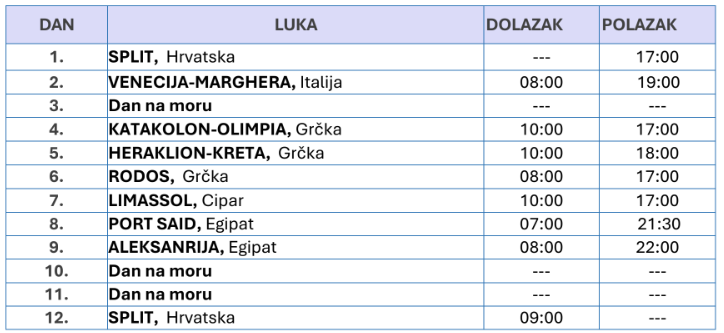 SPLIT – VENECIJA – KATAKOLON – HERAKLION - RODOS – LIMASSOL - PORT SAID – ALEKSANDRIJA – SPLIT
