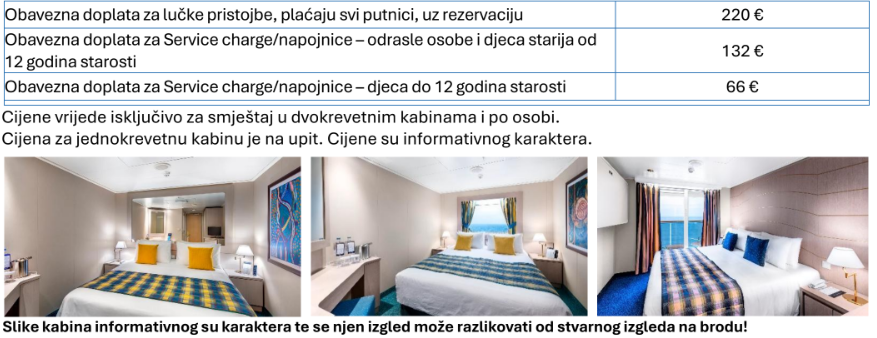 CIJENA ARANŽMANA PO OSOBI NE UKLJUČUJE: lučke pristojbe 220 €, napojnice (Hotel Service Charge, koje su obavezna