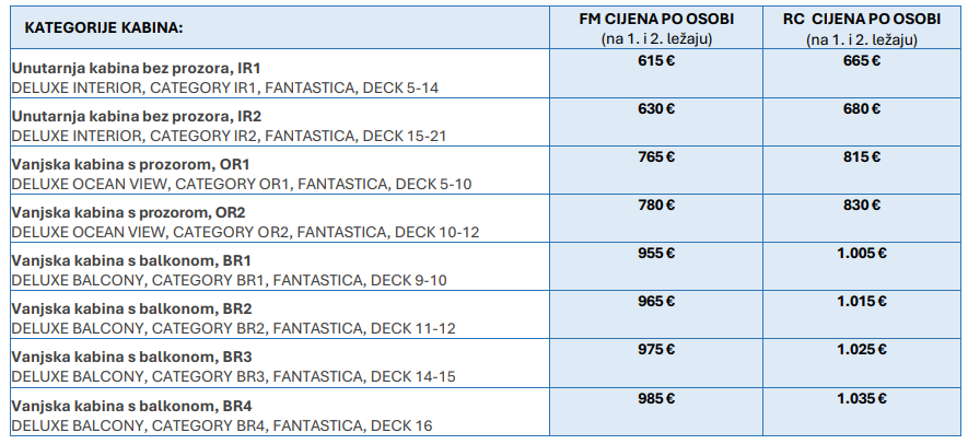 Navedene cijene u tablici vrijede isključivo za smještaj u dvokrevetnim kabinama te su izražene po osobi.