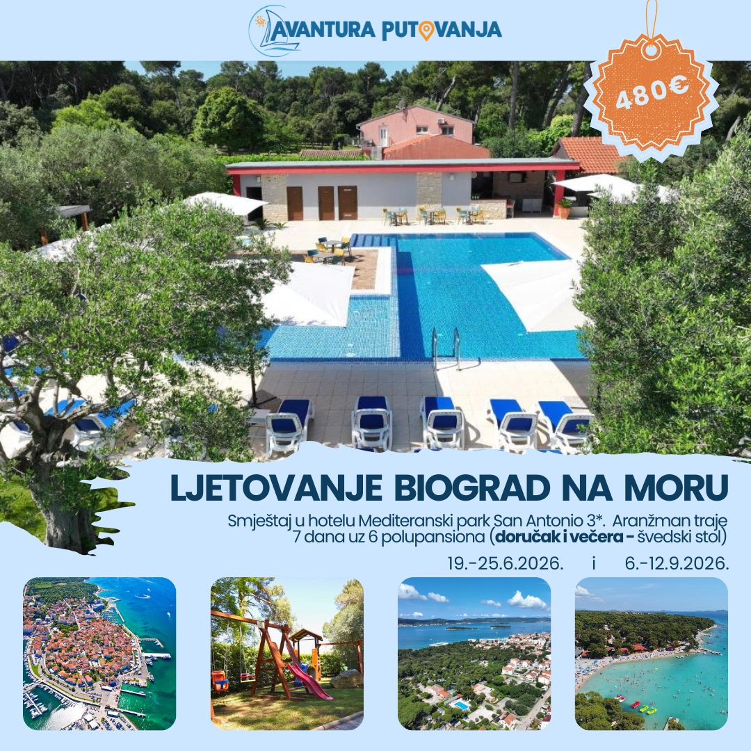 – Mogućnost smještaj u Mediteranskom selu ”San Antonio” 3* u Biograd na Moru, u dvokrevetnim, trokrevetnim i četverokrevetnim sobama na bazi 7 dana / 6 polupansiona (doručak i večera švedski stol)